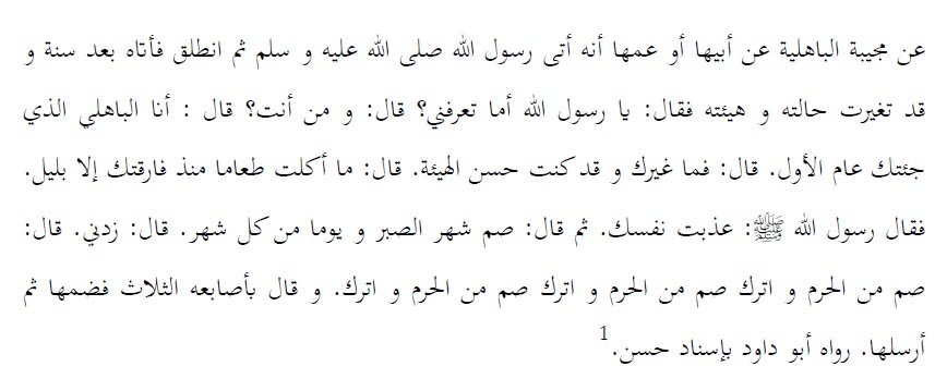 Dari Mujibah Al Bahilyah dari ayahnya atau pamannya, bahwasanya dia mendatangi Rasulullah Shallallahu ‘alaihi wa aalihi wa shohbihi wa sallam kemudian dia pergi. Maka dia datang kepada Rasulullah Shallallahu ‘alaihi wa aalihi wa shohbihi wa sallam satu tahun kemudian sedang keadaannya telah berubah, maka dia berkata: “Wahai Rasulullah, apakah engkau mengenalku?” “Siapa kamu?” tanya Rasulullah Shallallahu ‘alaihi wa aalihi wa shohbihi wa sallam. dia menjawab: “Aku adalah Al Bahili yang mendatangimu tahun lalu”. Rasulullah Shallallahu ‘alaihi wa aalihi wa shohbihi wa sallam bertanya: “Lantas apa yang membuat fisikmu berubah?”. Al Bahili menjawab: “Aku tidak memakan makanan sejak berpisah denganmu kecuali di malam hari”. Rasulullah Shallallahu ‘alaihi wa aalihi wa shohbihi wa sallam berkata: “Engkau telah menyiksa dirimu sendiri. Berpuasalah di bulan kesabaran (Ramadhan) dan sehari setiap bulan”. Al Bahili berkata: “Tambahkan lagi untukku”. Rasulullah Shallallahu ‘alaihi wa aalihi wa shohbihi wa sallam menambahan: “Berpuasalah di bulan Al Hurum dan tinggalkan, Berpuasalah di bulan Al Hurum dan tinggalkan, Berpuasalah di bulan Al Hurum dan tinggalkan.” Beliau isyaratkan dengan jari tangannya yang digenggamkan kemudian diulurkan tiga kali.
