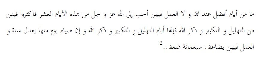 “Tidak ada hari yang lebih afdhol di sisi Allah dan tidak hari dimana amal ibadah disukai oleh Allah untuk dilakukan di hari tersebut sebagaimana hari-hari sepuluh ini (bulan Dzul Hijjah). Maka itu perbanyaklah oleh kalian dari tahlil, takbir dan dzikir kepada Allah karena hari-hari sepuluh tersebut adalah hari-hari tahlil, takbir dan dzikir kepada Allah dan sesungguhnya puasa satu hari darinya menyamai satu tahun dan amal ibadah dilipat gandakan menjadi tujuh ratus kali lipat”