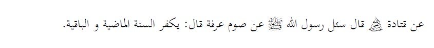 Dari Qotadah Radhiyallahu ‘anhu berkata bahwa Rasulullah Shalallahu alaihi wa aalihi wa shahbihi wa salam ditanya oleh para sahabatnya tentang puasa di hari Arafah, maka beliau mengatakan bahwasanya puasa di hari Arafah (atau ditanggal 9 bulan Dzulhijah) itu mengampuni dosa dua tahun, tahun yang lalu dan tahun berikutnya.